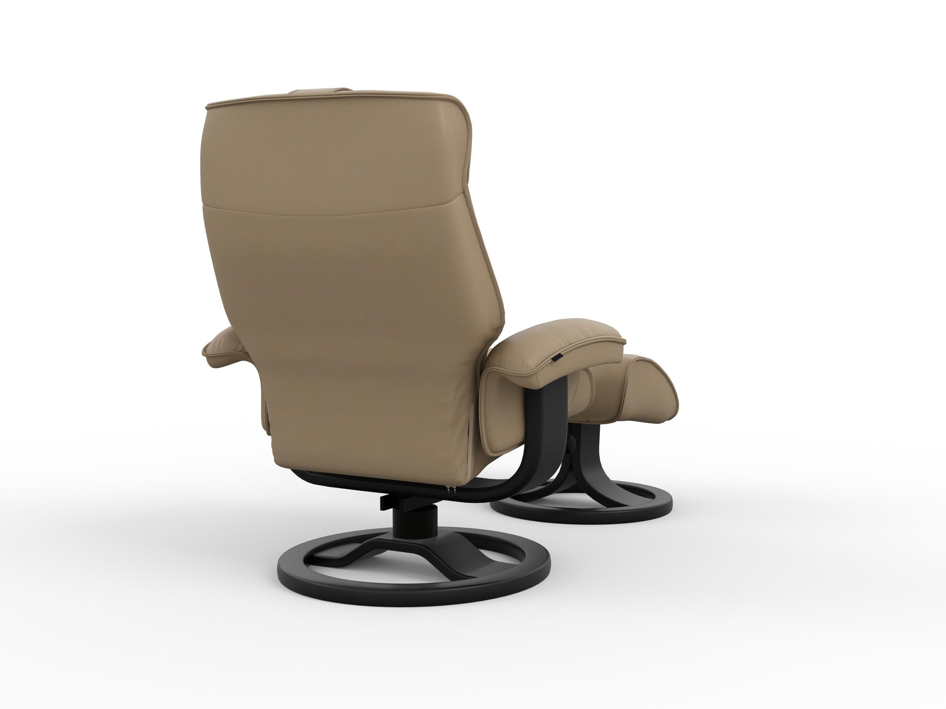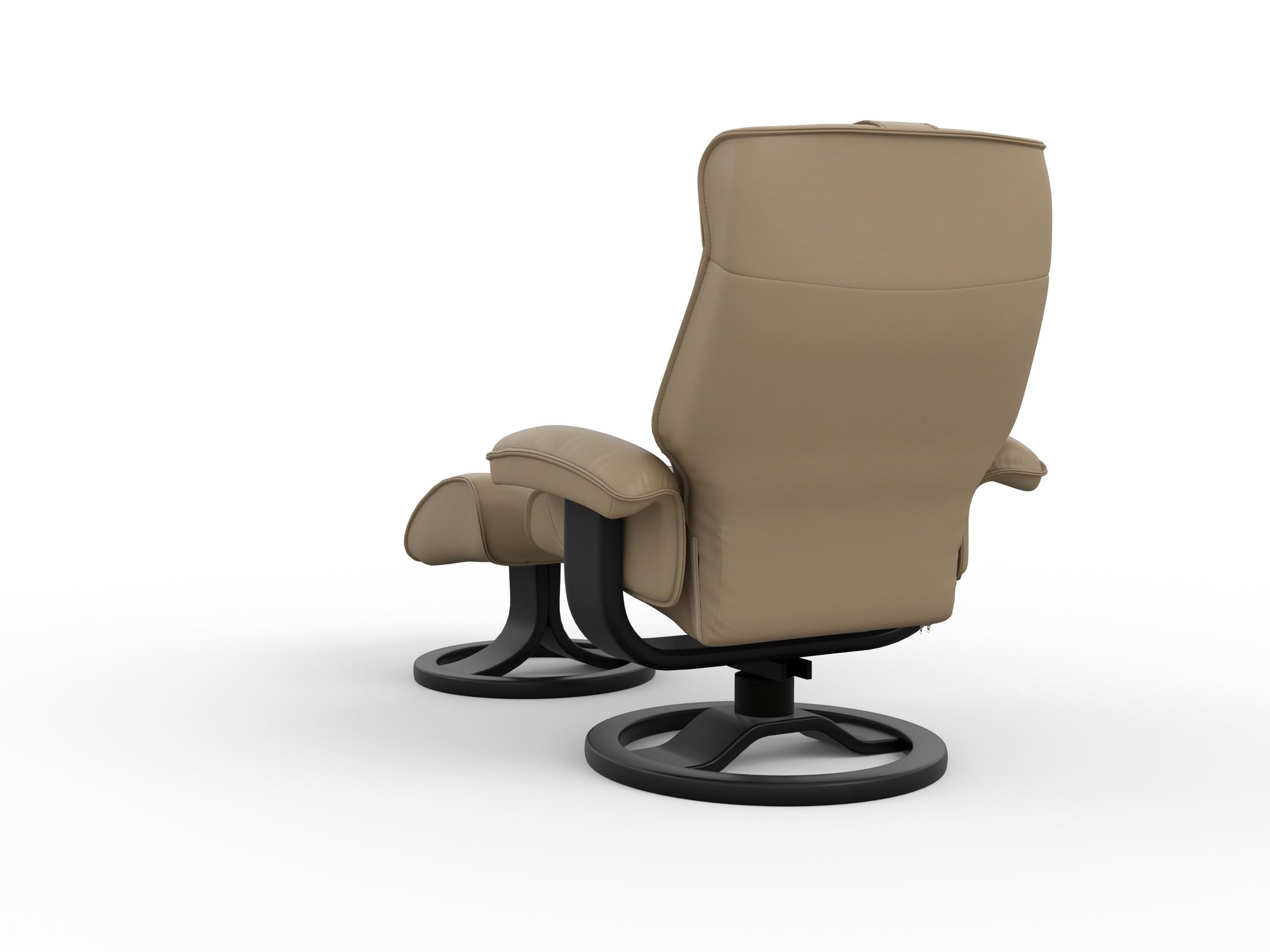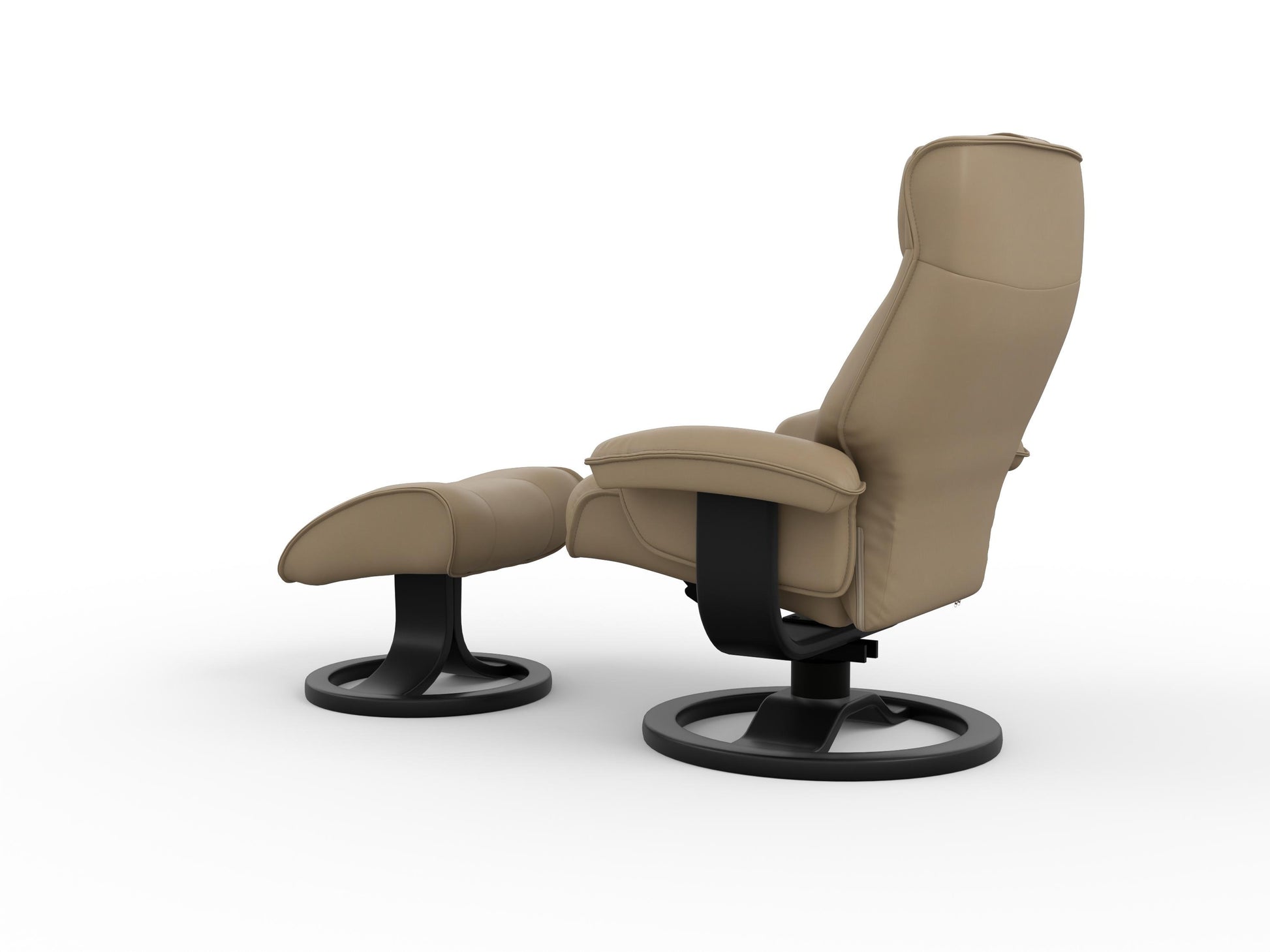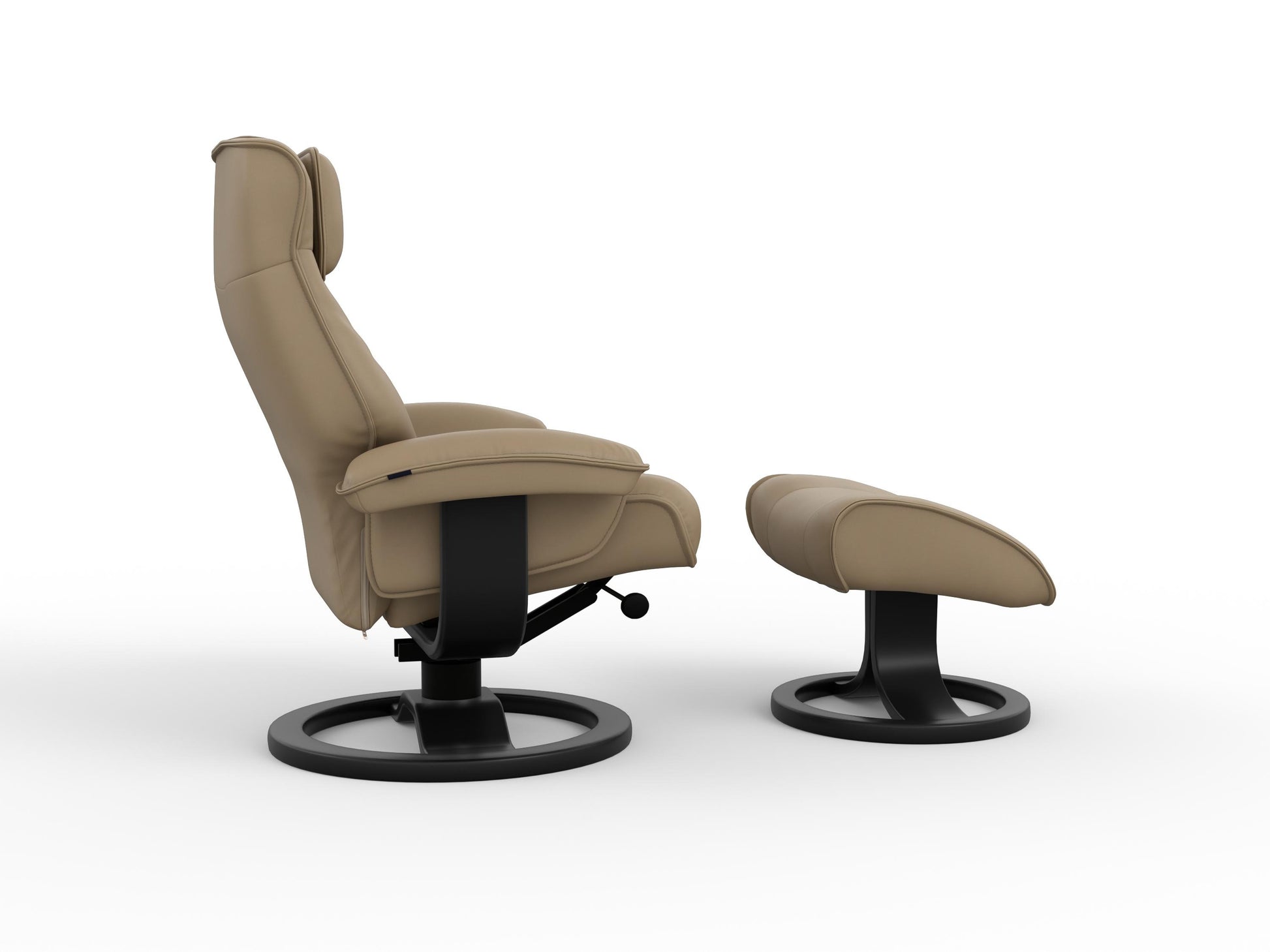The Fjords Mustang chair with variable adjustment provides continuous support and by means of our Fjords® Active Release System™ the neck angle is automatically adjusted while you recline, with bases which have a 360° swivel. The base is produced in laminated, stained wood which gives it an elegant character. Available in all our leathers and select fabrics, Mustang features a moveable neck pillow. The chair is available in two sizes, small and large.